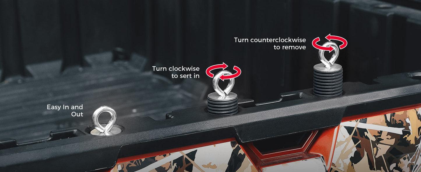 Kemimoto UTV bed anchors are easy to install and remove. Simply insert, and turn the eye bolt clockwise to tighten down. Remove it by turning the eyebolt in counter-clockwise direction. *Tips* If they are hard to mount, please wet the surface of Kemimoto anchors with dish soap water or lubricant, which would help insert easily.