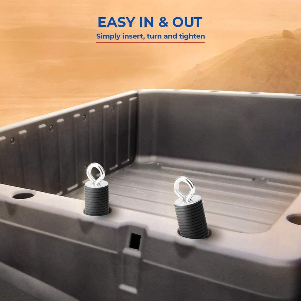 With the tie down anchors inserted in the bed hole, they have a super grip. When used with straps and bungee cords, these tie down anchors will play an important role in tying down cargos you are carrying, such as hunting gear, fuel, cooler, gun tool boxes etc.