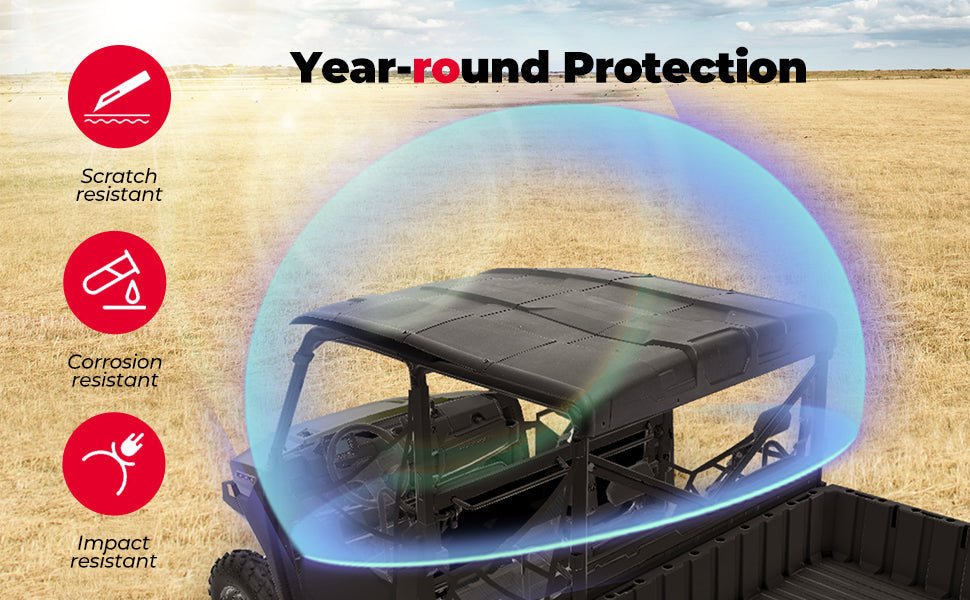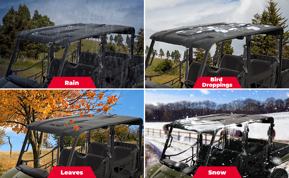 A hard roof top can protect you and your passengers from elements that may fall from above, such as bugs, tree branches, rocks, and debris. It can also prevent dirt from accumulating in your UTV cab.