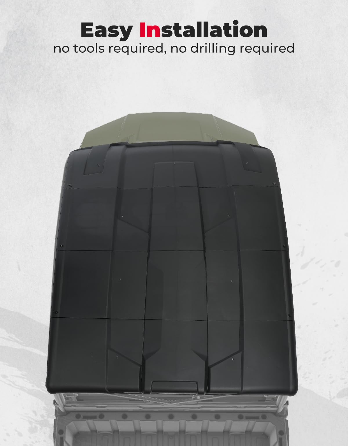 4-piece design roof top for simple, quick installation, removal, and storage. No drilling is needed, and all hardware will come with the crew top. All necessary hardware is included, saving you time and hassle.
