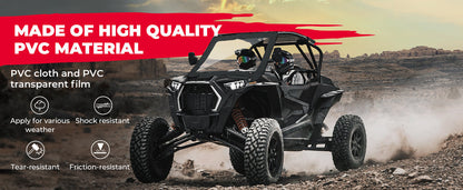 This UTV front windshield frame is made of PVC cloth, which is water-resistant, strong, friction-resistant, and tear-resistant. The windshield center is made of PVC high-definition transparent film, providing a clear view.