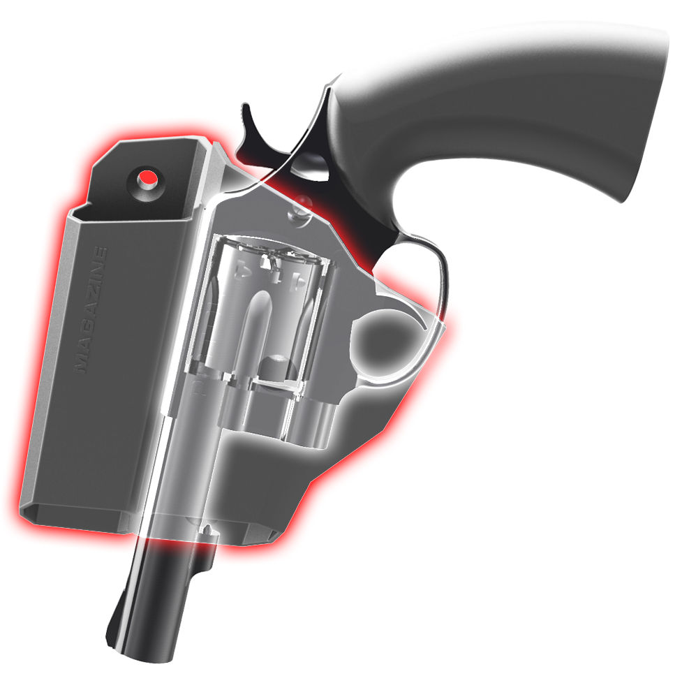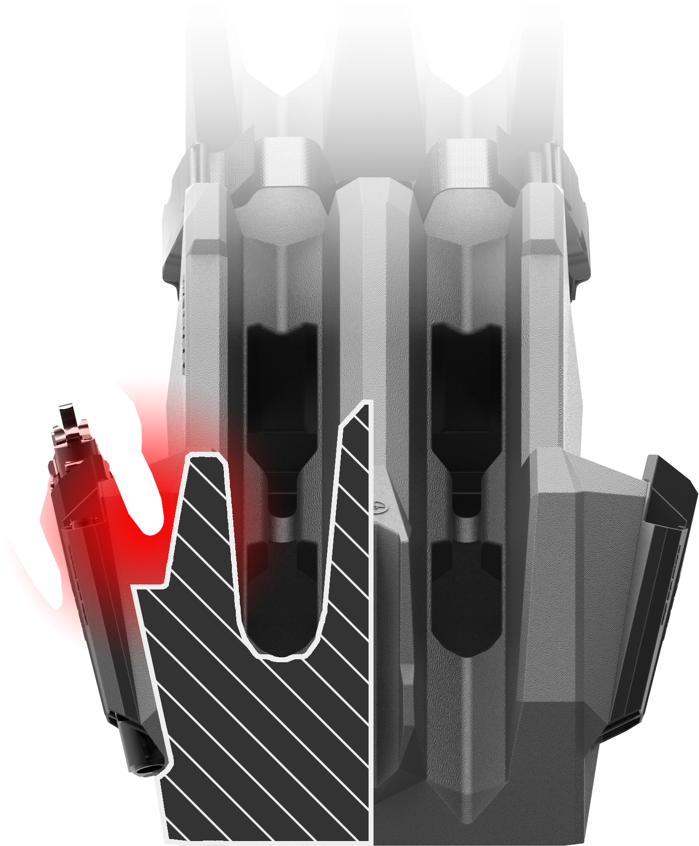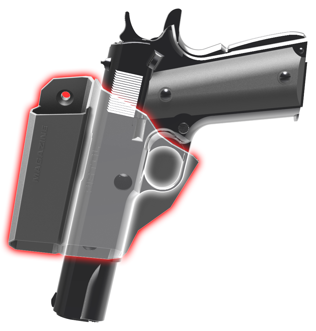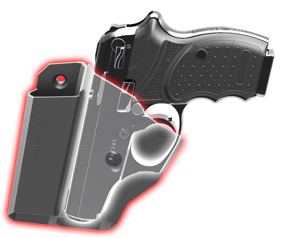 MAGAZINE HOLDER — Extra magazines can be stored separately in divided slot. Magazine and gun do not contact each other preventing scratches.