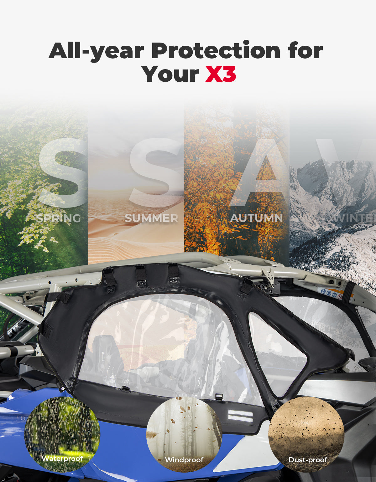 The Kemimoto Can Am Maverick X3 Soft Cab Enclosure provides protection against sun, rain, and dust during summer, and against wind, snow, and cold during winter. The transparent film can be rolled up for ventilation when needed.