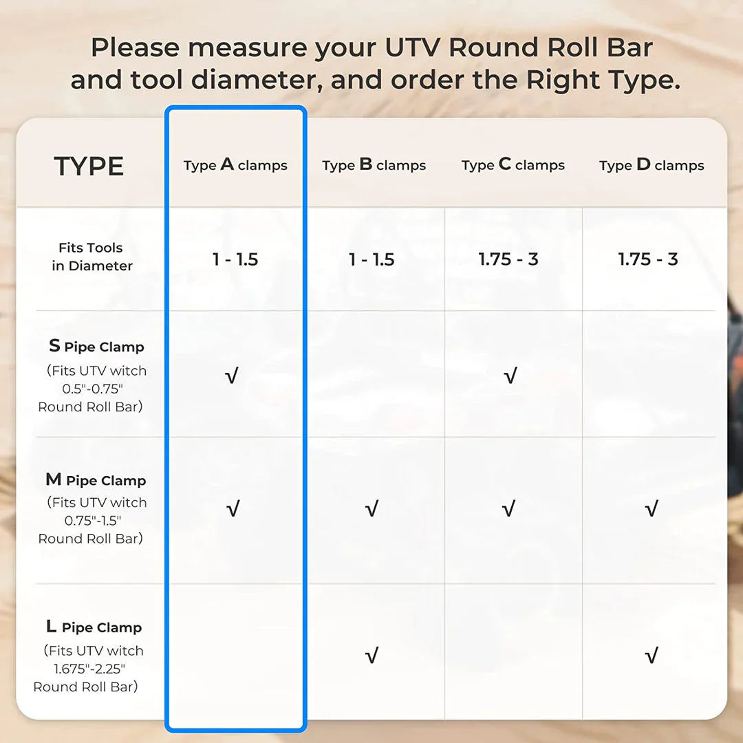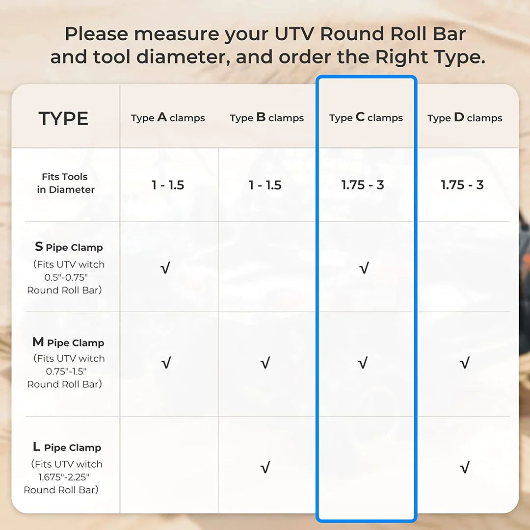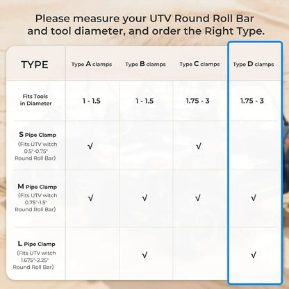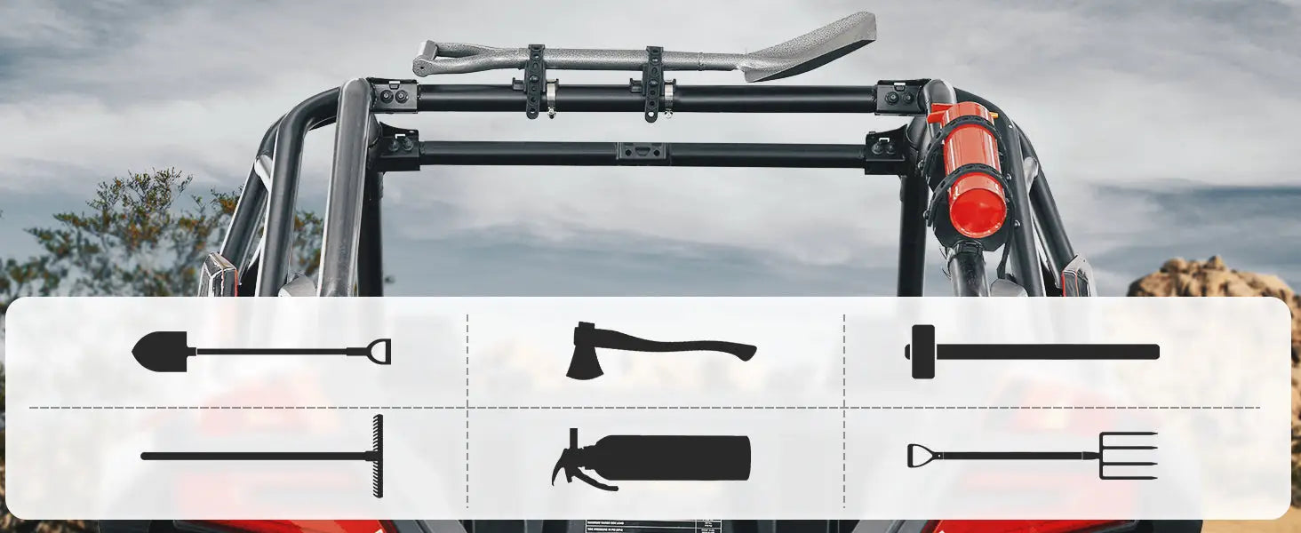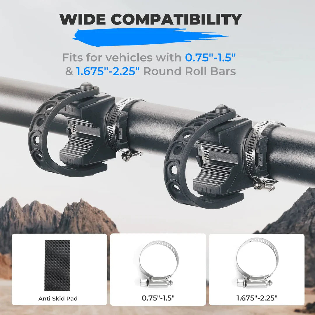 Rubber Tool Clamp fits ATV UTV with 0.75 inch to 2.25 inch roll bar. The rubber pads make it non-slip on the roll bars. Also Fits RV ladder Jeep off-road adventure with round tube.