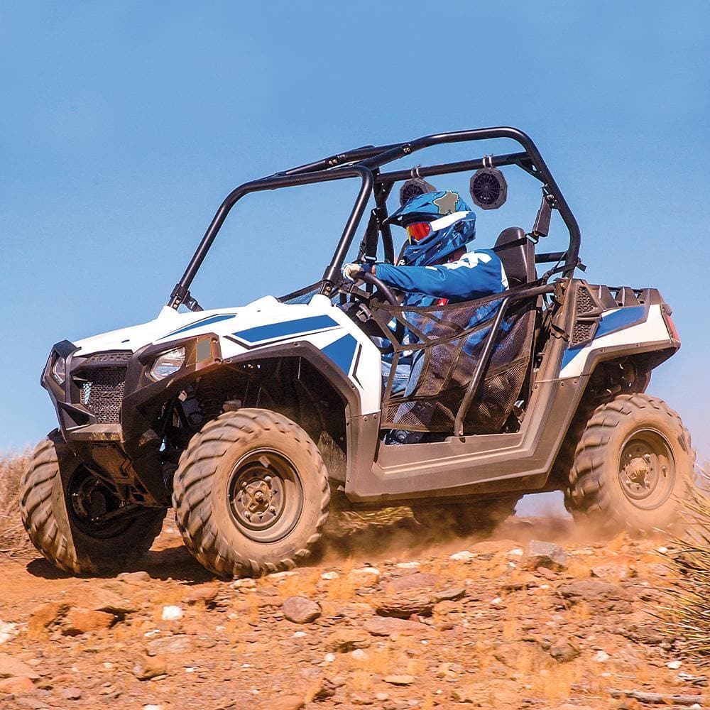 Putting your speakers inside UTV speaker mount and plugging in, then attaching the speaker to the roll cage with adjustable mounting clamps. Installation is done.