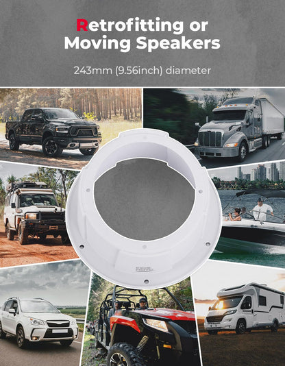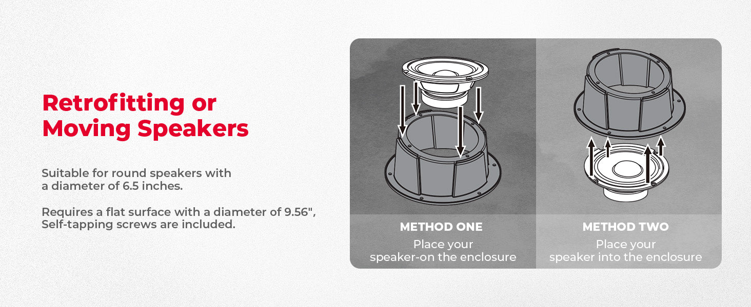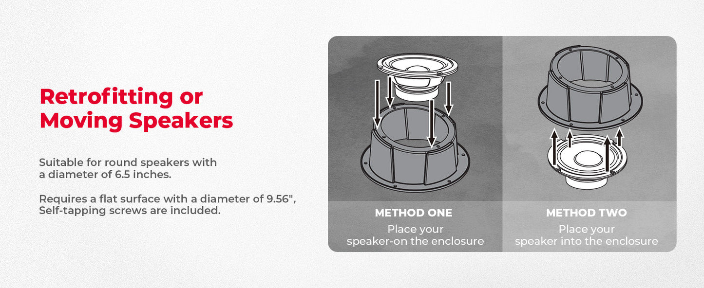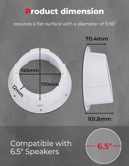 KEMIMOTO speaker box enclosure fits 6.5 inch speakers perfectly, and it can be mounted on 243mm (9.56inch) diameter circular flat surface, such as UTVs, ATVs, Cars, Boats, Trunks, Trailers, etc. Besides, it is compatible with can am maverick x3/ sport/ trail, compatible with polaris ranger, rzr, compatible with pioneer, talon, etc.