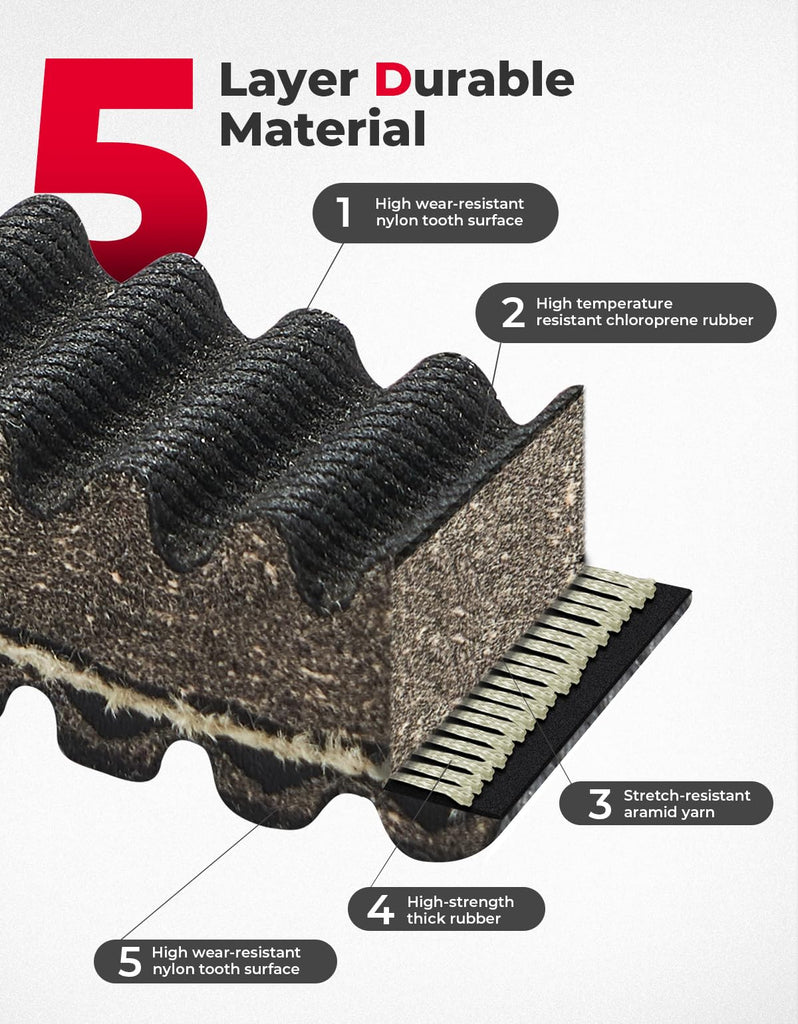 Feel confident on rough terrain with this clutch belt's tough construction, built to withstand wear and tear. With nylon tooth surfaces, double-layer thick chloroprene rubber, and aramid yarn, belts are less likely to break or fail than other types of drive belts.