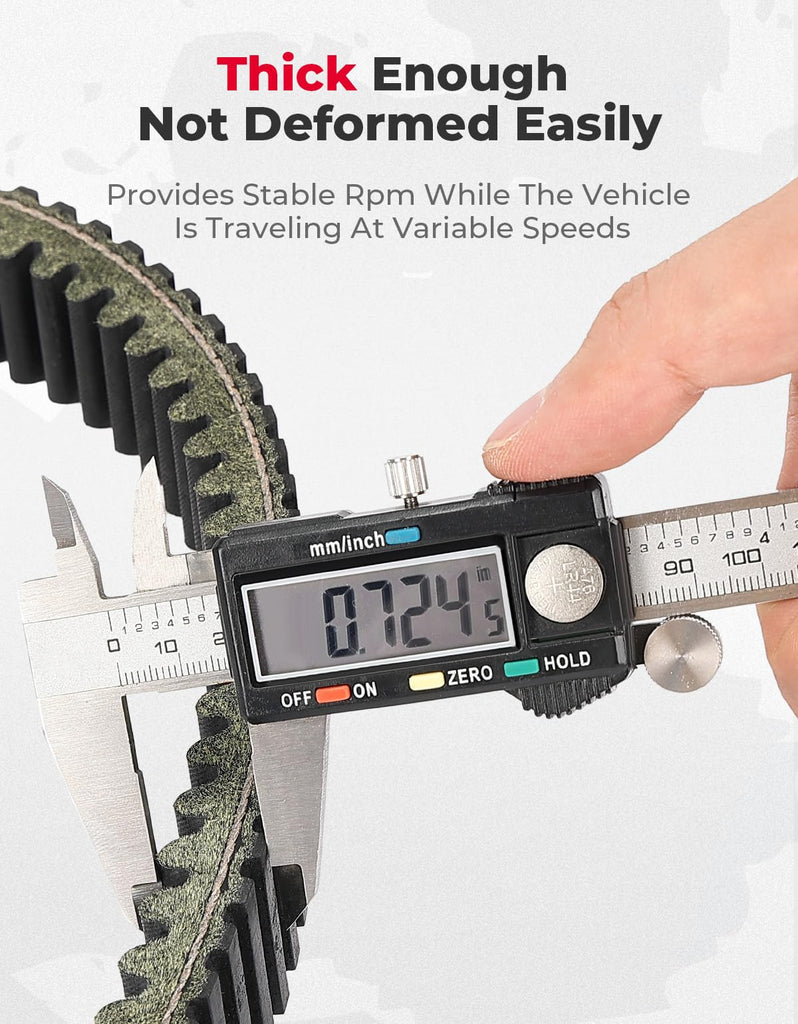 The inner elastic nylon fabric of our drive belt ensures it can withstand high-strength tension. As the vehicle travels at variable speeds, this belt provides stable RPM, wears evenly, and reduces belt failure. Rest assured, it offers the performance and durability you need, even in the most demanding off-road conditions.