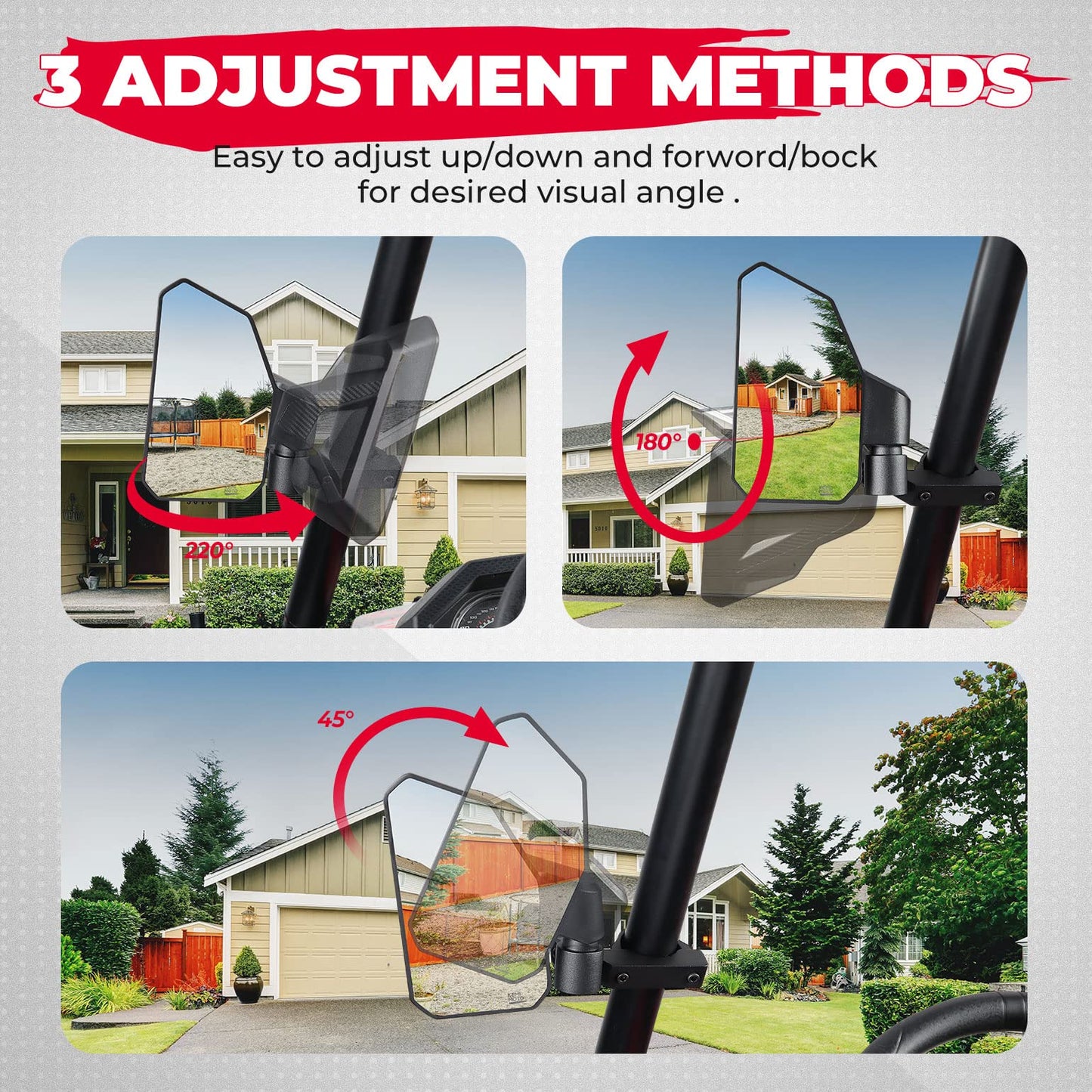 The KEMIMOTO SXS side mirrors have 3 adjustable direction that allow you to adjust the mirrors high/low and forward/backward for the desired visual angle. Now you can see behind without looking back.